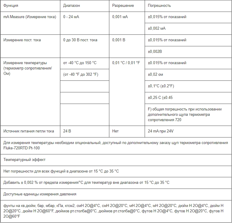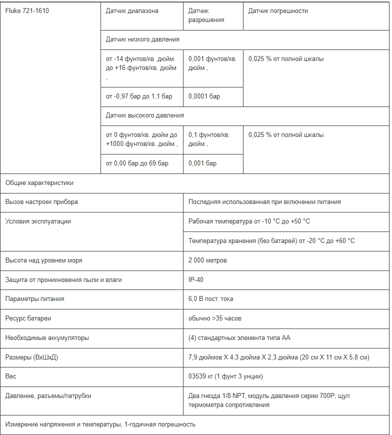 Калибратор Fluke 721 может быть оснащен одним из датчиков низкого давления (16 фунтов/кв. дюйм (1,1 бар) или 36 фунтов/кв. дюйм (2,48 бар)) и одним из 7 устройств высокого давления, включая 100, 300, 500, 1000, 1500, 3000 или 5000 фунтов/кв. дюйм (6,9, 20, 24,5, 69, 103,4, 200, 345 бар).