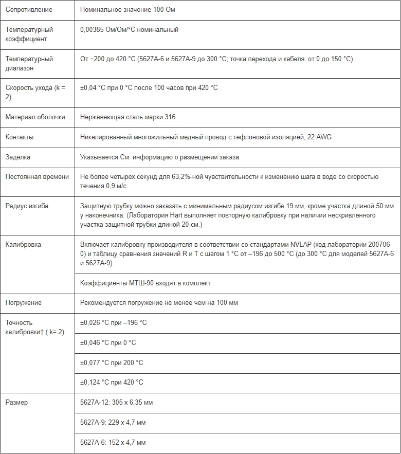 Датчики 5627A работают в диапазоне температур до 420 °C с точностью до ± 0,025 °C. Они выпускаются в трех различных вариантах длины. (Шести- и девятидюймовые модели работают в диапазоне от –200 до 300 °C.) К каждому прибору предоставляются собственные коэффициенты МТШ-90 и калибровочная таблица с шагом 1 °C.