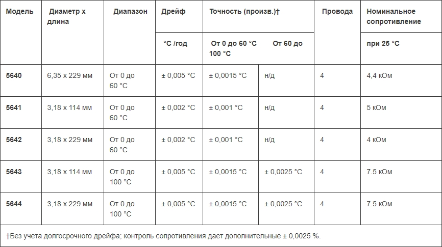 Термисторные датчики 5640, 5641 и 5642 предназначены для диапазона температур от 0 до 60 °C, а датчики 5643 и 5644 – от 0 до 100 °C. Они обеспечивают стабильность на уровне ± 0,002 или ±0,005 °С, гарантированный на один календарный год.