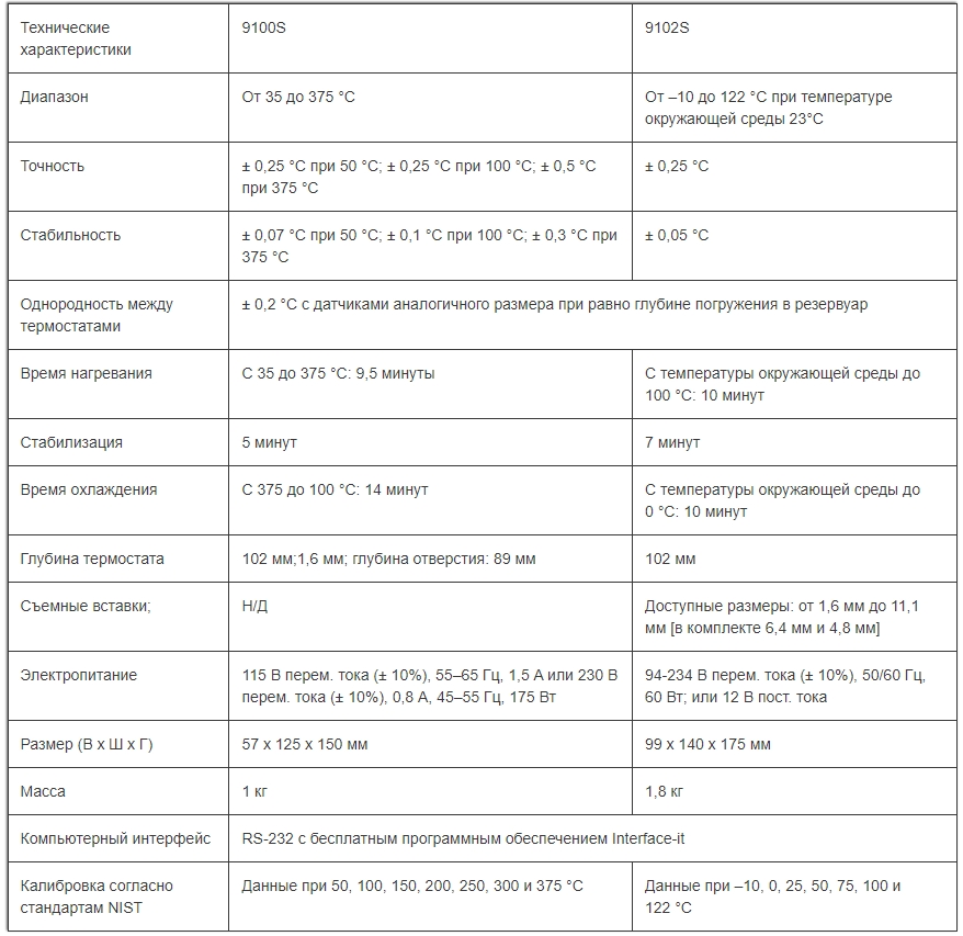 Модель 9102S имеет два резервуара, один из которых для повышения точности можно использовать под эталонный термометр. Оба резервуара имеют диаметр 1/2 дюйма, для каждого из них доступны вкладки, позволяющие работать с датчиками практически любых размеров. Кроме того, к модели 9102S можно заказать комплект батарей, обеспечивающих до четырех часов работы в полевых условиях в отсутствие питания переменного тока.