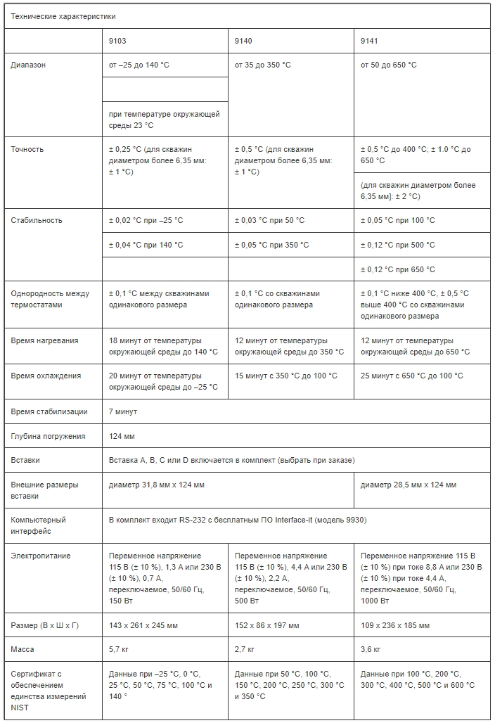 Модель 9103 охватывает диапазоны температур ниже температуры окружающей среды вплоть до –25 °C. Модель 9103 обладает стабильностью до ±0,02 °C, а ее дисплей калиброван с точностью ±0,25 °C при любых температурах в пределах рабочего диапазона. Температура 0 °C достигается всего за 8 минут, а температура 100 °C – за шесть минут, поэтому время тратится не на ожидание, а на калибровку.