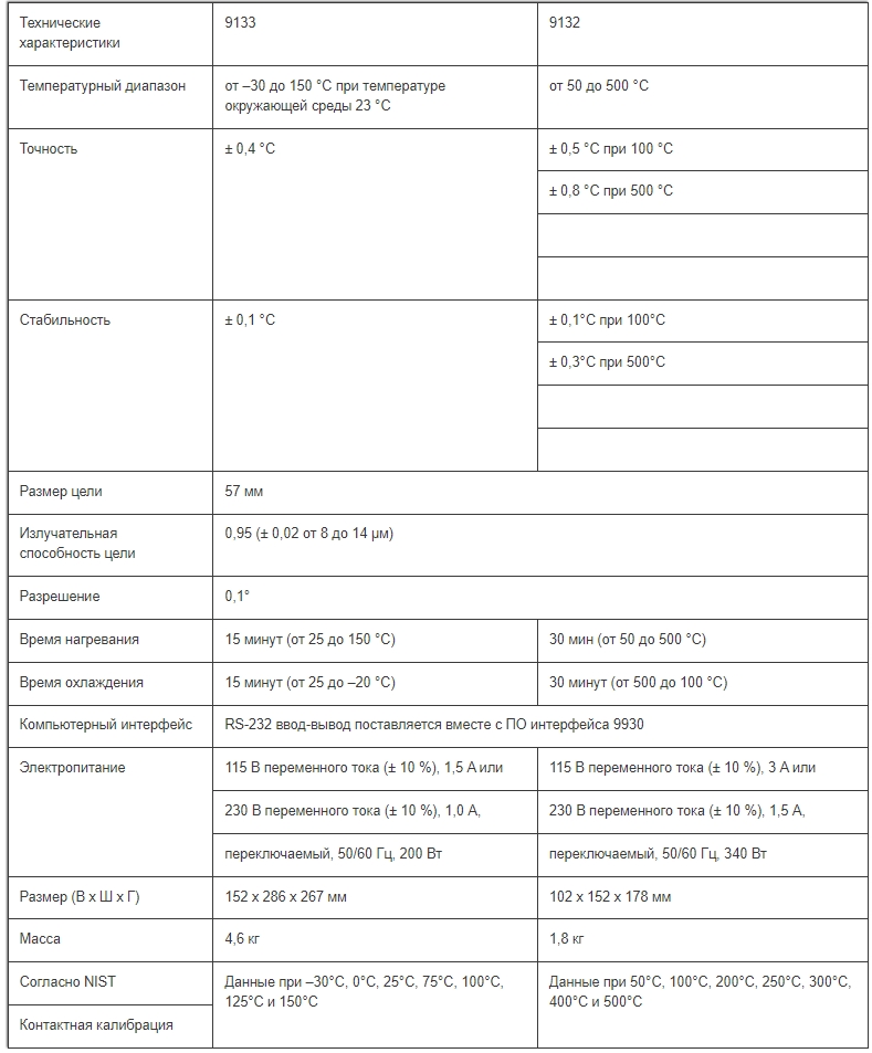Эти приборы имеют измеряемую поверхность контролируемой температуры диаметром 57 мм. Заданная температура может контролироваться с установленным шагом в 0,1° от –30 до 500 °C, а резервуар находится непосредственно за поверхностью черного тела для контактной калибрации.