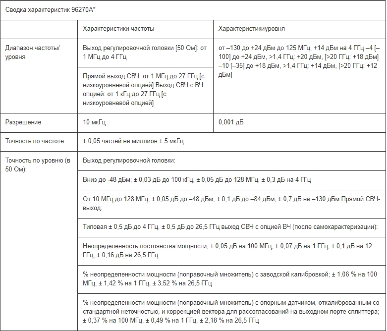 Базовый опорный источник 96270A поставляется с регулировочной головкой 50 Ом. 96270A/75 включает головки 50 Ом и 75 Ом. Регулировочная головка обеспечивает равномерное и плавное затухание, модуляцию и сигналы низкого фазового шума до 4 ГГц, охватывая 80 % контрольных точек любого частотного анализатора спектра, включая высокочастотные модели, и подходит для калибровки линейности датчиков мощности. Также на СВЧ-выход 96270A, расположенный на передней панели, подаются сигналы на частотах от 1 МГц до 27 ГГц с уровнем погрешности, сравнимым с большинством генераторов сигналов общего назначения.