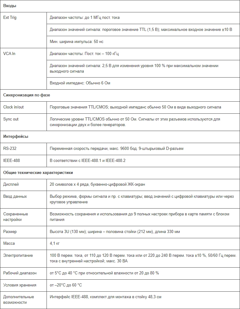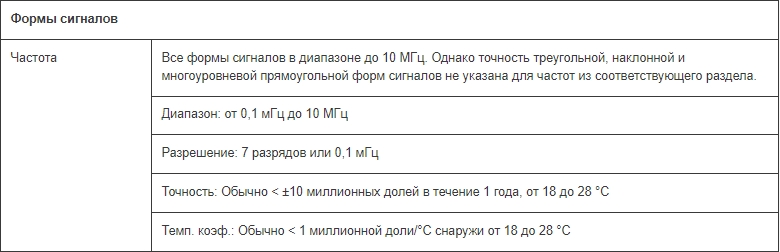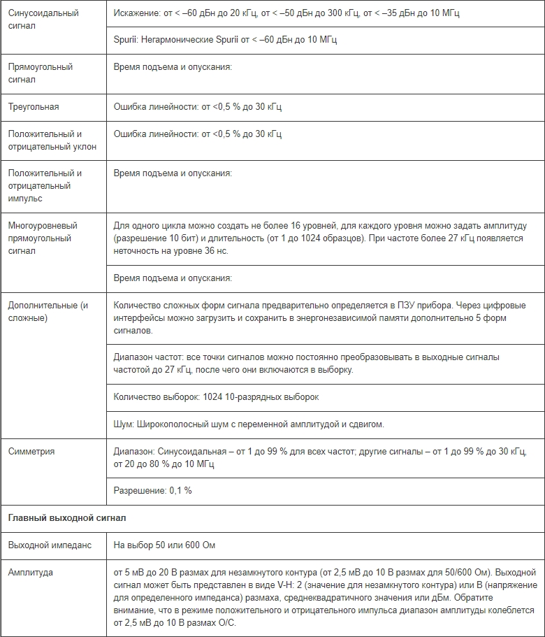 Стандартные формы сигналов: синусоидальная, прямоугольная, положительный импульс, отрицательный импульс, треугольная, наклон вверх, наклон вниз. Возможность получить дополнительные формы сигналов, многоуровневые прямоугольные волны, скачкообразные сигналы и псевдослучайный шум.
