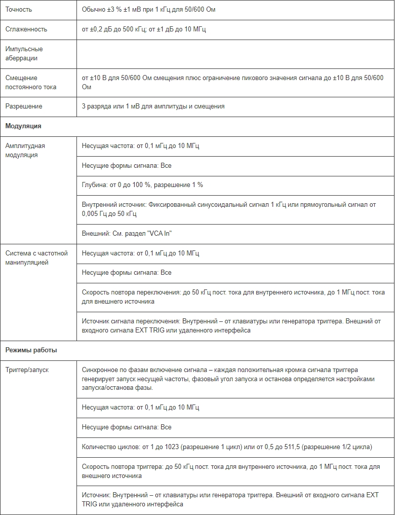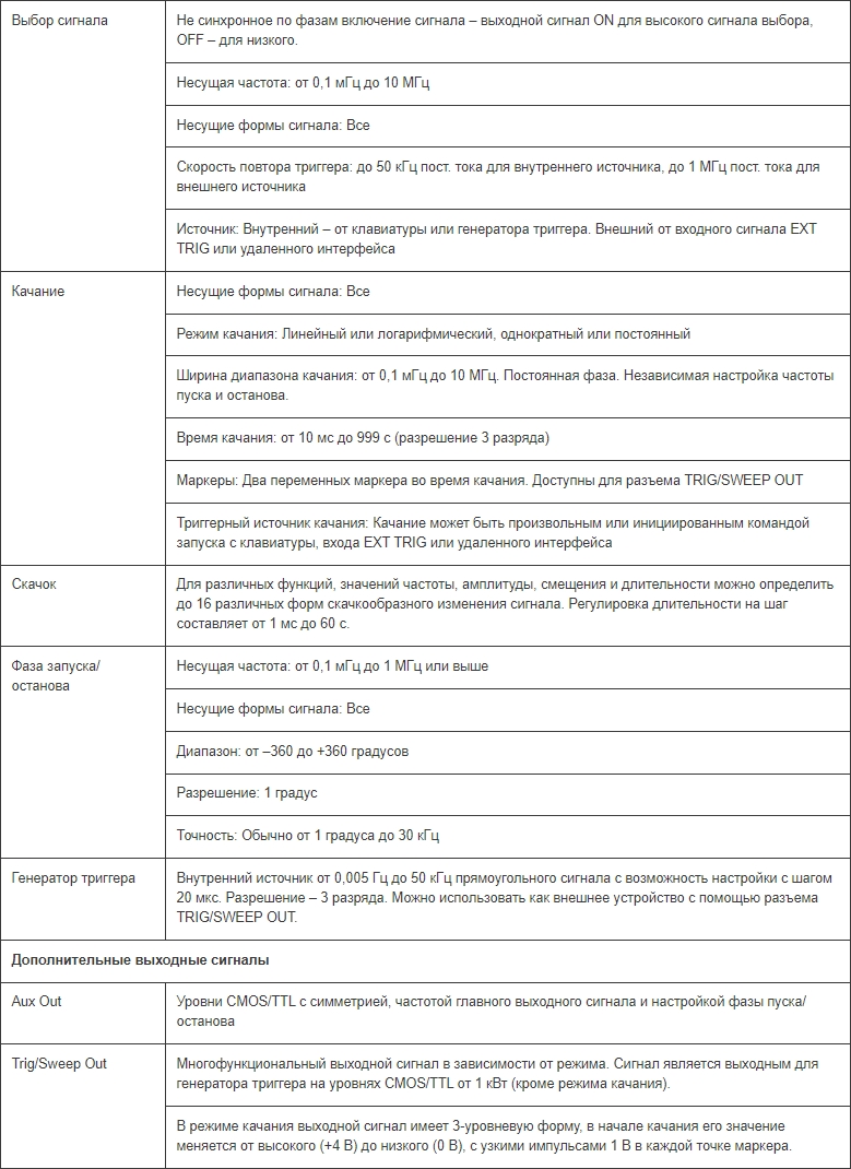 Возможности модуляции: качание, AM, выбор сигнала, триггер/запуск, частотная модуляция и скачок.