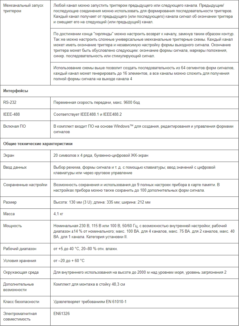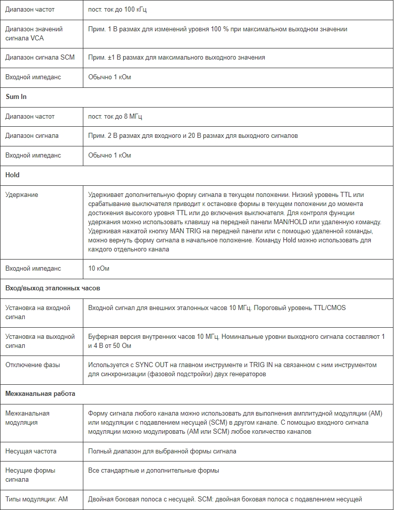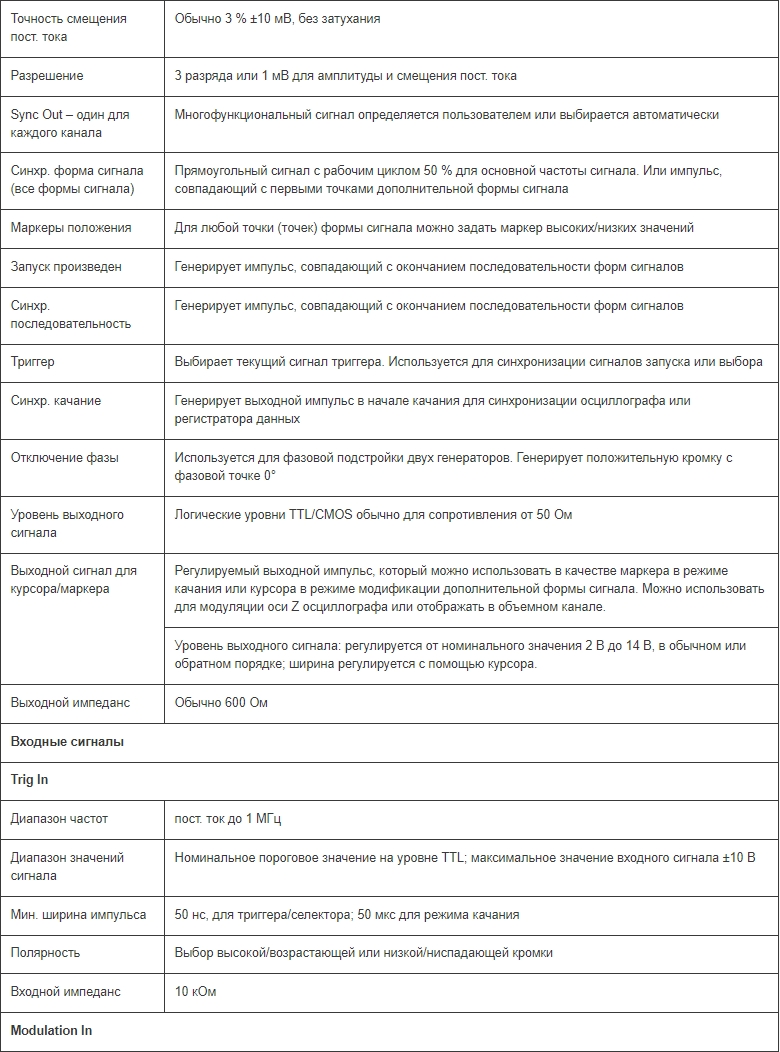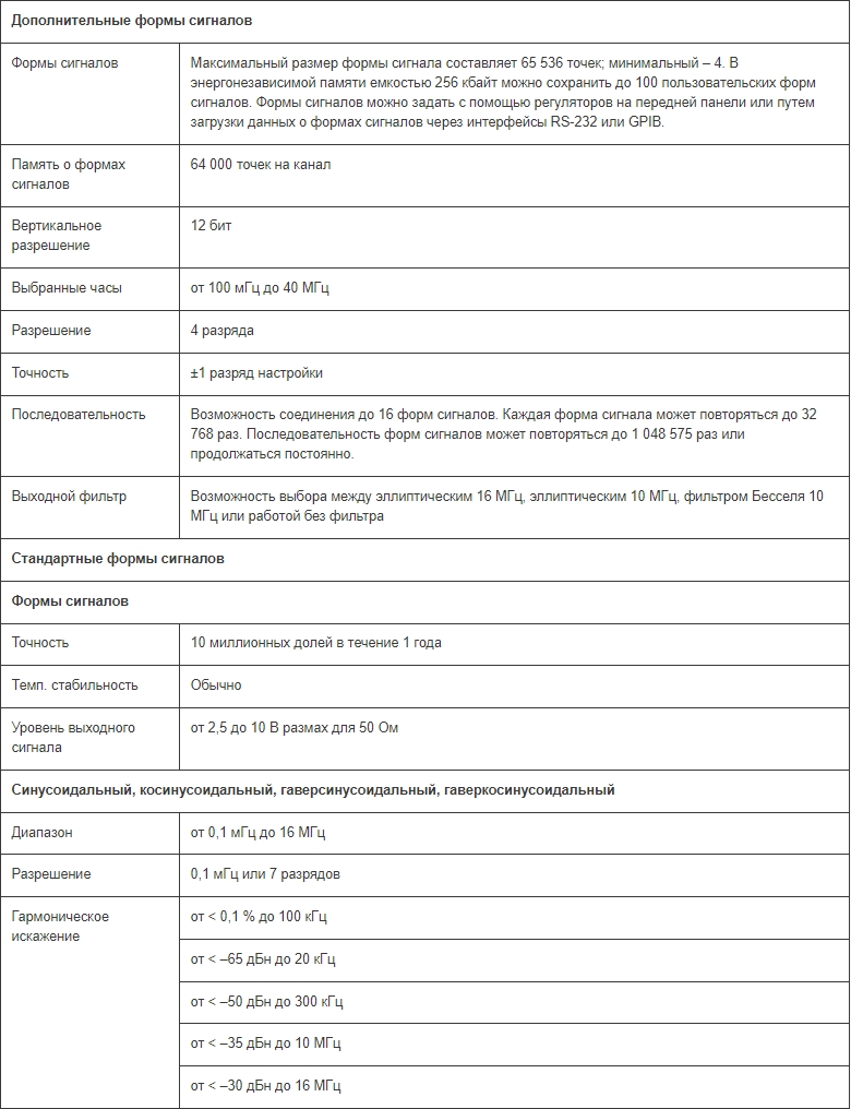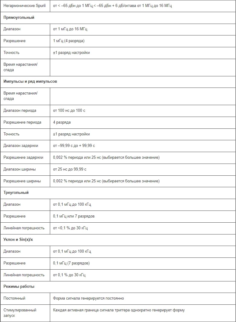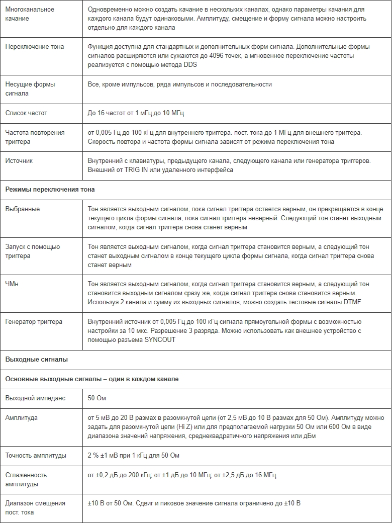 Стандартные формы сигналов: синусоидальная, прямоугольная, треугольная, пост. ток, положительный и отрицательный уклон, кардинальный синус, импульс, ряд импульсов, косинусоидальная, гаверсинус и гаверкосинус. Диапазон выходной частоты составляет от 0,1 мГц до 16 МГц для синусоидального и прямоугольного сигналов и до 100 кГц для треугольного сигнала, уклонов и кардинального синуса sine(x)/x. Время подъема для импульса составляет