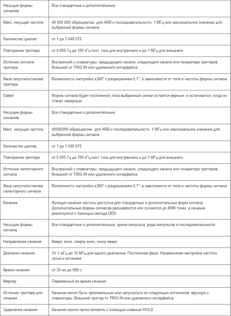 Все формы сигналов можно запустить с помощью триггера, каждая кромка триггера создает один запуск несущей частоты. Фазы запуска и останова являются переменными. Режимы триггера и запуска можно реализовывать с помощью внутренних триггерных генераторов, от соседнего канала, внешнего источника, клавиши или удаленной команды. Сигнал триггерного генератора можно при необходимости выделить отдельно.