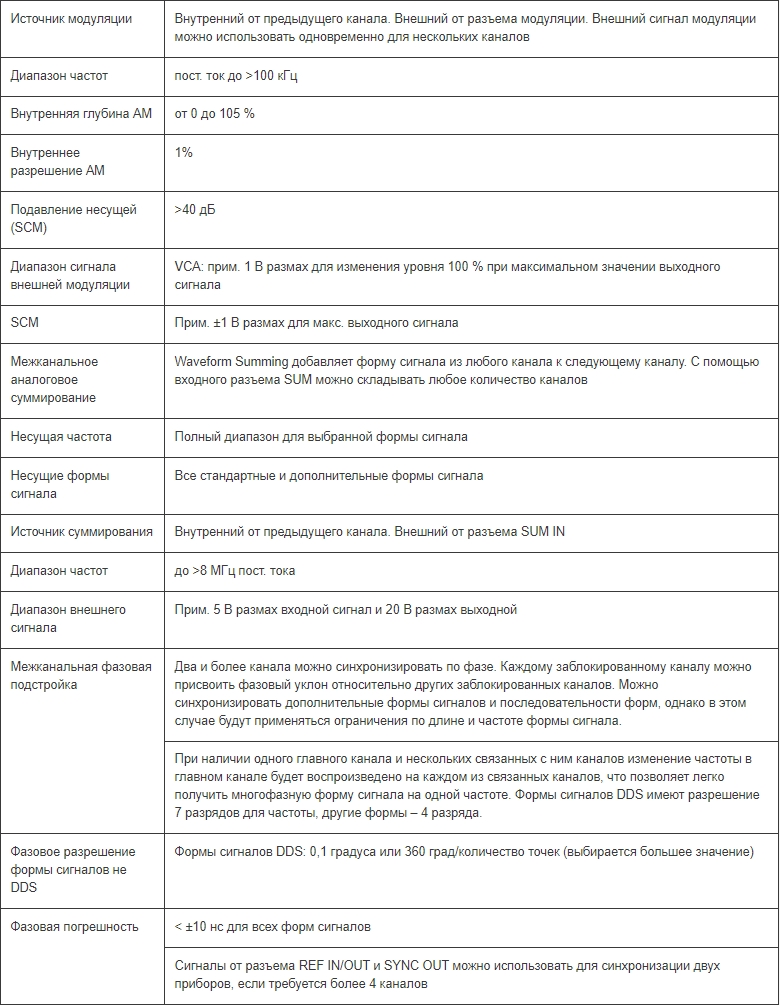 Амплитудная модуляция и модуляция подавленной несущей доступны для всех форм сигналов. Любой канал можно использовать для модуляции любого другого канала. С помощью входного сигнала модуляции можно одновременно провести модуляцию всех каналов.