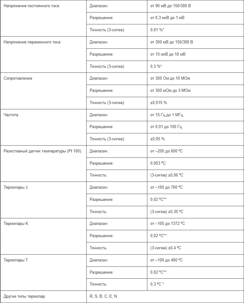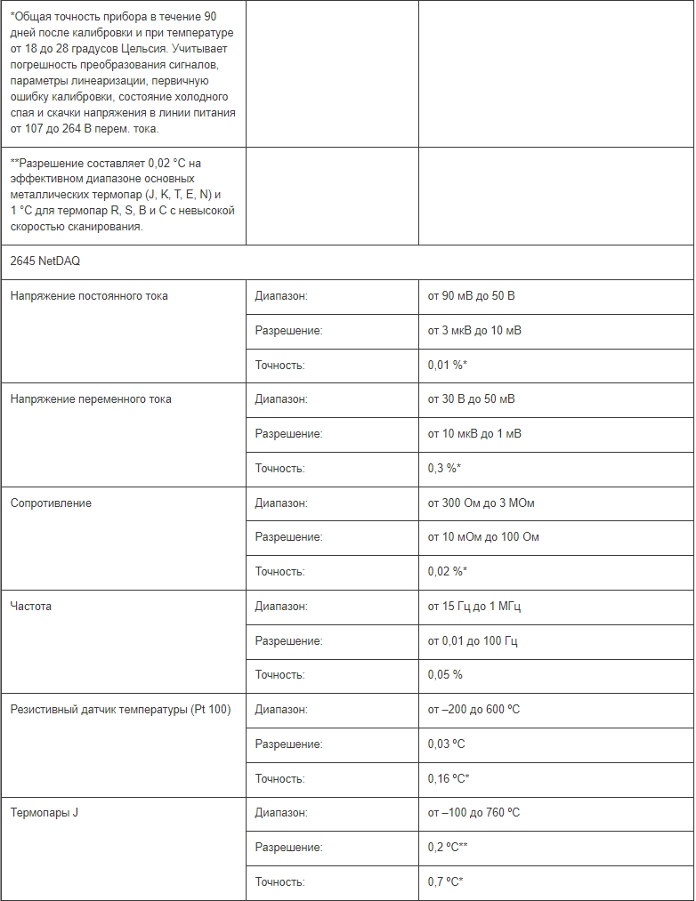 Мы предлагаем разные варианты точности и скорости измерения в зависимости от поставленной задачи. Модуль 2640A обеспечивает точность термопары 0,01 % В пост. тока и 0,3 ºC и разрешение 18 бит, скорость сканирования составляет от 6 до 100 каналов в секунду. Модуль 2645A может сканировать со скоростью от 48 до 1000 каналов/сек. с разрешением 16 бит и точностью термопары 0,01 % В пост. тока и 0,6 ºC.