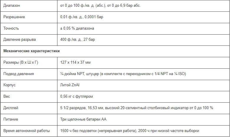 - Диапазон измерения абсолютного давления 15, 30, 100, 300 ф./кв. д. (абс.)